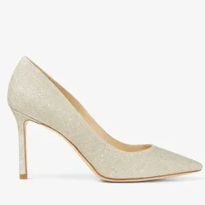 The ever-classic Romy heel gets a statement update in platinum ice dusty glitter. The 85mm heel height provides a leg-lengthening effect. Steal the show at your next party invite in these head turning heels.