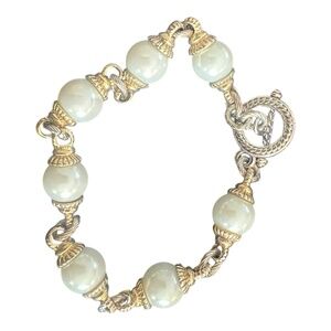 Beautiful unmarked pearl bead bracelet featuring round creamy white beads separated by decorative gold-tone wire-wrapped links and finished with a silver-tone toggle clasp. This piece has a classic, elegant look and can easily be dressed up or worn casually. No maker’s marks or metal purity stamps were found, so it is being sold as unbranded / fashion jewelry.