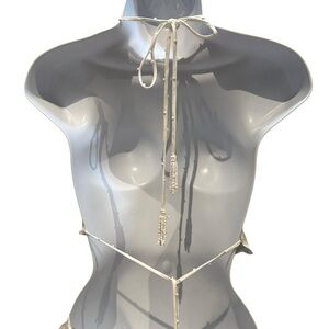 Farm Rio | White Halter Richilier Cotton Ruffle Dress | Large New with Tag. Tag says midi dress but it’s more mini/knee length. Knee length for me and I am 5’ 2” for reference. Has 4 ties at open back with beaded ends. No chest measurements because there are no defined sides. Has side zipper for bottom half. 16” flat across waist. 36” in length.
