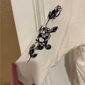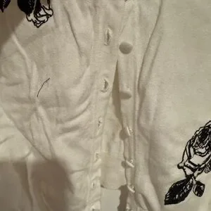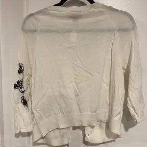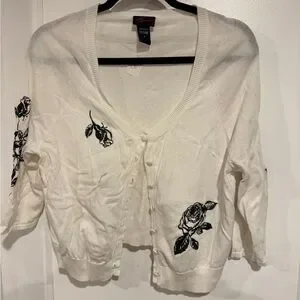 Elegant white cardigan sweater with black floral accents. Perfect for adding a touch of sophistication to any outfit. Sleeves hit mid elbow, stretch throughout