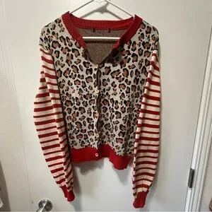 Chic cardigan with leopard pattern and red stripes. Eye-catching design for any outfit.