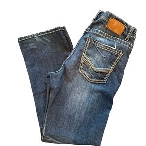 Buckle brand blue denim jeans with a classic design. Features detailed stitching on the back pocket.