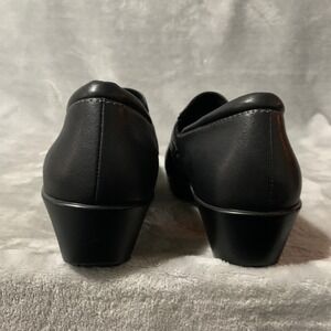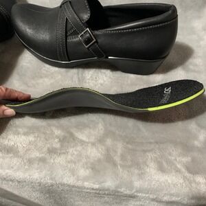 Keywords: Abeo shoes, comfort clogs, leather clogs, black mules, buckle detail, womens size 10, orthotic friendly, everyday wear, work shoes, casual footwear, slip on shoes, supportive shoes