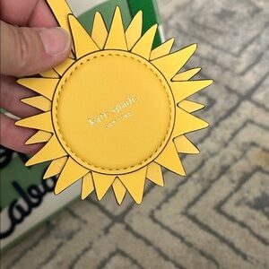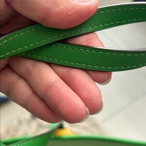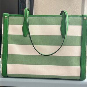 Chic tote with bold green and cream stripes. Features playful lettering and sunflower charm. Ideal for stylish outings. Does not come with dust bag.