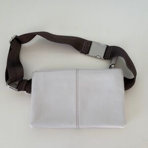 Leather white belt bag with brown straps and silver buckles. Two exterior front pockets and large interior pocket. Strap is adjustable and the bag can be worn across the chest or at the waist.