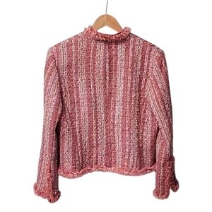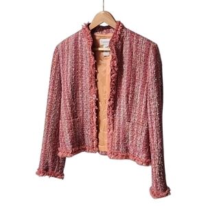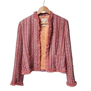 CHADWICKS VINTAGE Pink Boucle Tweed Crop Jacket 10 M Blazer Ribbon Fringe Shaggy