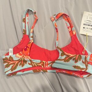 Vibrant floral bikini set featuring red, coral, green and baby blue colors. Reversible. Adjustable straps. Perfect for a stylish beach day.