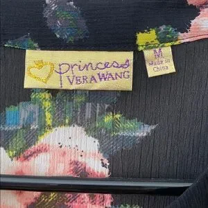 EUC no flaws noted , princess by Vera Wang Sheer Floral blouse, long sleeve , button up @ V-neck, black w pink and green floral rose print