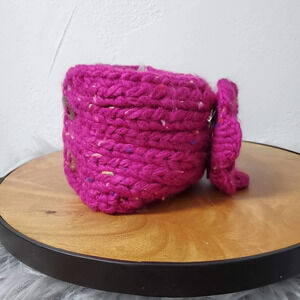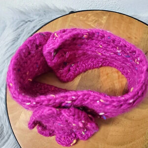 Crochet braided knit headband earwarmer with two button faux wood closure, open top, and removable crochet braided knit flower clip pin in a pretty fuschia purple with hints of blues, greens, pinks, and yellows.