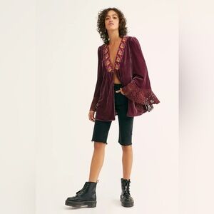 Victorian-inspired velvet jacket featuring metallic embroidered trim with a button-up front and lace cuffs.