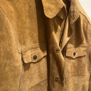 Elevate your outdoor style with this classic tan field jacket. Designed for comfort and durability, it's perfect for any adventure. It is reversible! One side suede and the other leather.