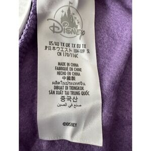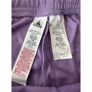 The product is a pair of women's Disneyland Resort Spirit Jersey fleece sweatpants in size 1X. These lounge pants feature the iconic Disney characters and storylines associated with the Disneyland franchise. The purple color adds a touch of fun and whimsy to the design, making them perfect for any Disney fan looking to stay cozy and stylish. Made with high-quality materials, these sweatpants are a must-have for any Disney collector or enthusiast.
