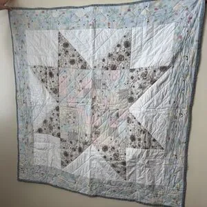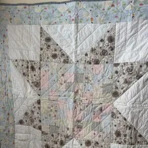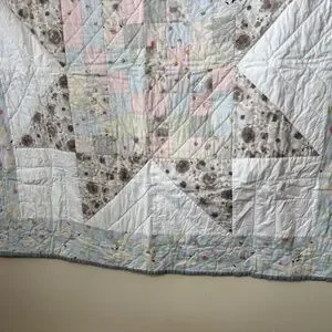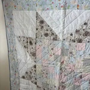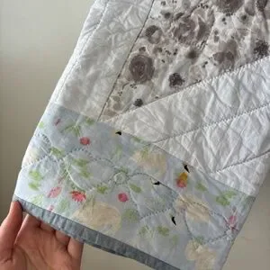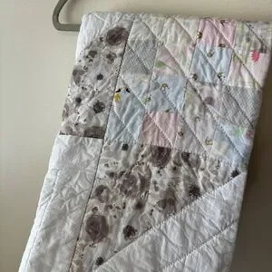 Hand stitched quilt perfect for a baby quilt, lap quilt, or wall hanging. Light pastel colors. Floral designs with gold crowns and charming swans swimming in a pond with water lilies. So incredibly cute! Would make the perfect gift or purchase to welcome a little one. Dusty blue back. Cotton material. 40 inches by 40 inches. No spots or stains.