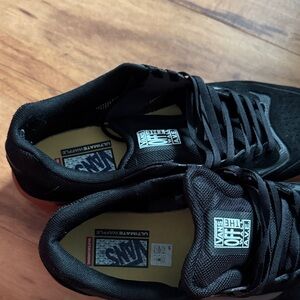 Classic Vans sneakers in black with tan soles. Stylish and comfortable for daily wear. Ultimate Waffle insole, worn one time