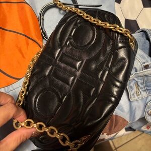 Elegant black crossbody bag. Features gold hardware. Iconic Ferragamo design.