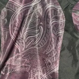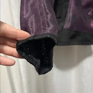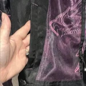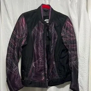 Stylish riding jacket with intricate purple designs. Features a sleek black base. Ideal for a bold look.