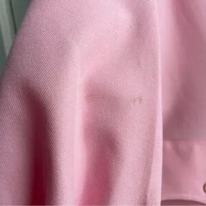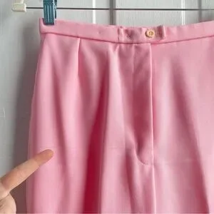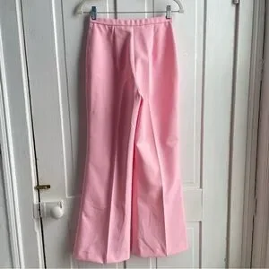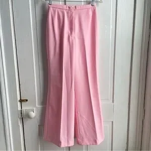 Vintage 70s Women’s Bubblegum Pink Dagger Collar Polyester Leisure Pant Suit Set. This set comes with the 4-Pocket Jacket and matching wide leg pants. This set is so cool! Style it 70s for a vintage vibe, or it could be styled very modern for a Barbie or Legally Blonde fit! Originally marked a size 10, but see measurements for best fit. Material does not stretch. Overall good vintage condition with just a few small flaws. On the right arm of the jacket, there is a small pen mark and a light stain. It has been through a regular wash, not sure if a more aggressive treatment could remove either of these. The pants have a thread pull on the top right side. Please review all photos.