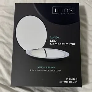ILIOS LED compact mirror with rechargeable battery. Includes storage pouch.
