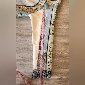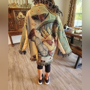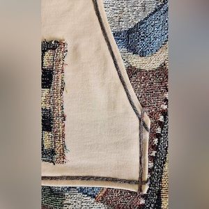 Completely homemade and handmade with recycled materials, thrift store and unwanted clothing items and thrown out tapestry blanket! Lots of hours at home on the sewing machine. One of a kind and made with love and a lot of thought!