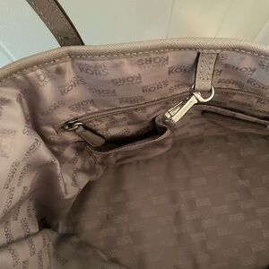 Michael Kor jet set travel tote is crafted with Saffiano leather in a gray color. Has some wear & tear (pictured). Some stains inside (pictured). 11” height, 20” wide, 7” at bottom.