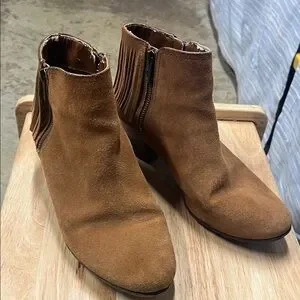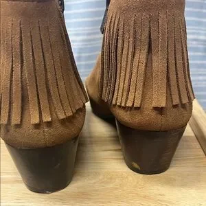 Step out in style with these chic fringe leather ankle boots. Perfect for any occasion, these brown boots add a touch of elegance to your outfit. Minor wear on the heel and inner liner (see photos)