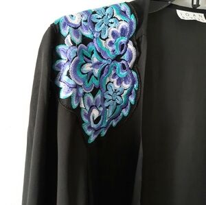 Elegant black sheer topper featuring vibrant blue and purple floral embroidery on the shoulder. Perfect for adding a touch of color to your outfit.