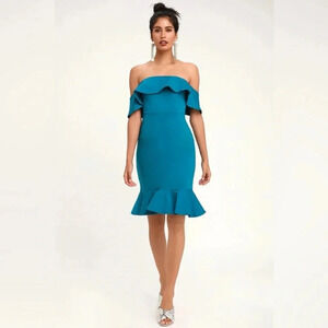Lulus Confidence Boost Teal Blue Off-the-Shoulder Bodycon Midi Dress Size Small