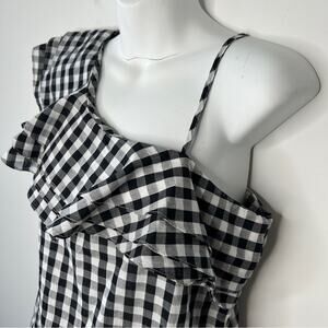 Black and white gingham shirt with one ruffle shoulder that goes across bust, and one adjustable strap on the other side. Zips up the side on left side.