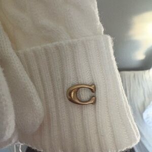 Stylish cream knit hat and gloves by Coach. Ideal for warmth and fashion. In the colour CHALK.