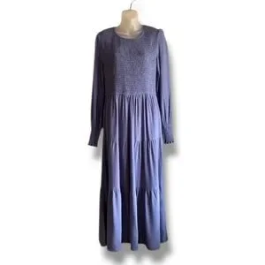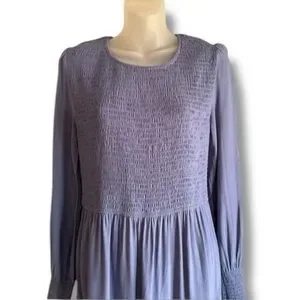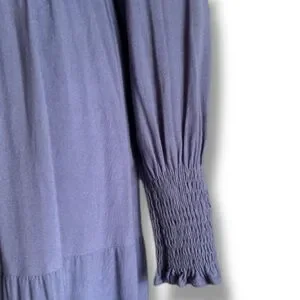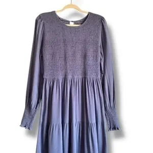 ZESICA long sleeve pullover dress with keyhole closure at back, crew neckline, smocked cuff sleeves, smocked ruche bodice to high waist (front and back) and Flowy tiered skirt in midi length. Sleeves also have the smocking at the wrist. Soft and flowy.
