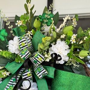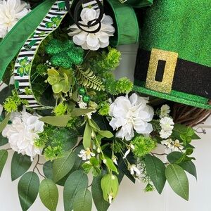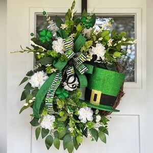 Celebrate St. Patrick's Day with this vibrant green wreath, featuring a sparkling leprechaun hat, white flowers, green tulips, clover and lush greenery and a gorgeous bow made of green Dupioni ribbon and black, white and green St Patrick’s Day ribbon. Perfect for adding a festive touch to your home. Measures 21x30x9”