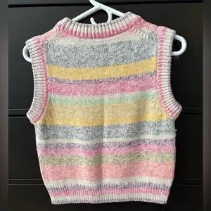 Vibrant sweater vest with multicolor stripes. Features pink, yellow, and gray hues. A versatile layering piece that can be styled for both casual and dressy occasions.