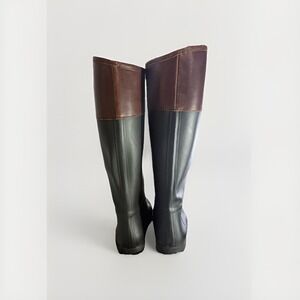 Tory Burch Womens Riding Rain Boots Size 7 Black Brown Logo Classic Rubber Tall