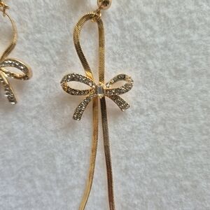 Long ribbon bow gold tone pierced earrings. Tiny rhinestones. Nickel free. NWOT Never worn. Measurements are approximate measurements: