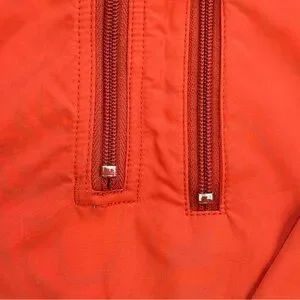 Good vintage condition. Paint chipping on zipper pull stops, one very small cut at the upper back near the collar, minor fabric snags along the back bottom near the hem, and one small ink dot stain on a white panel. All flaws are small and not very noticeable during wear. please review all photos.