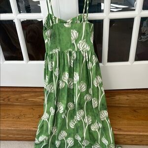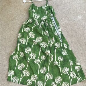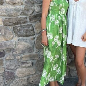 This elegant green maxi sundress features a halter neckline and a sleeveless design, perfect for a wedding guest. The cream floral with subtle grey pattern adds a touch of sophistication, while the flowing style ensures comfort and grace.