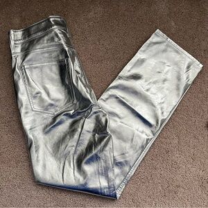 Shiny metallic faux leather silver pants. Eye-catching and stylish. Fitted through the hip and thigh, straight leg. Ankle length. Long inseam (29.5”).