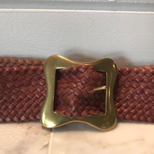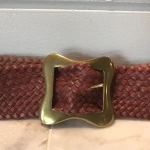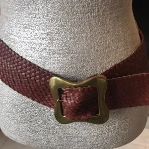 Elegant woven belt. Features a gold-tone buckle. Perfect for any outfit.
