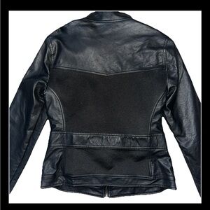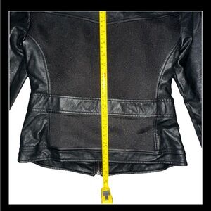 Chic black leather jacket by Marvel. Features stylish design and comfortable fit. Ideal for versatile wear. Please see photos for condition. In good condition, some wear on the shoulder as seen in photo.