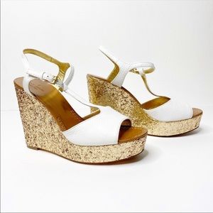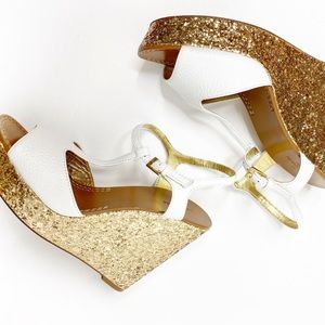 Elegant platform sandals with white leather straps. Glittery gold wedge heels. Perfect for adding sparkle to any outfit.