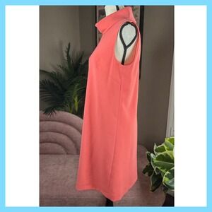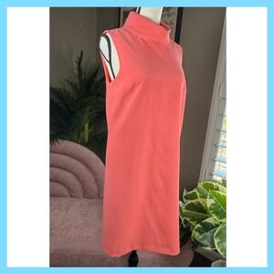 Keywords: shift dress, sleeveless dress, mock turtleneck dress, coral dress, pink dress, mod dress, vintage dress, retro dress, women's dress, dress, party dress, casual dress, midi dress, work dress