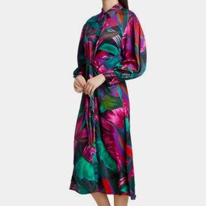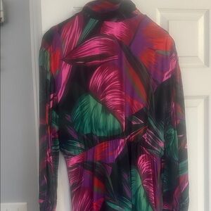 Bold shirt-dress with striking leaf design, tie front w/ button closure. No pockets & not lined.