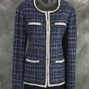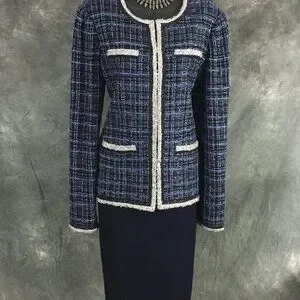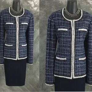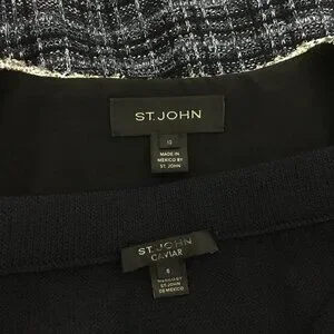 Beautiful knit 2pc skirt suit by ST. JOHN. Please note- Jacket is size 10, and skirt is size 8, but please refer to the measurements for great fit. Jacket has five hook buttons to close. It has real pockets. Skirt has elastic waist. There is no flaw or stain and suit is in EXCELLENT CONDITION LIKE NEW. If you see any spot that is from the camera. If you have any question please let me know.