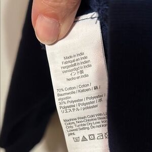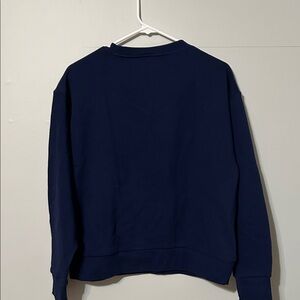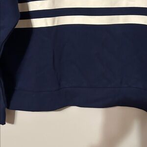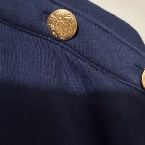 NWT: navy sweater/sweatshirt with bold white stripes. Accented with gold decorative buttons on the shoulder. Slight rib on cuffs and waistband.