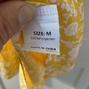 The dress in the image is the Dokotoo Blouson Sleeve Midi Dress in a yellow and white floral print. This flowy, bohemian-style dress features 3/4 length blouson or puff sleeves, a V-neck with a tie front, and a gathered waist.