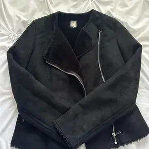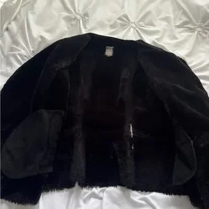 Chic black fur jacket by Zara! Features an asymmetric zipper and sleek design. Ideal for stylish outings~ the fur is lined all inside and in the sleeves.