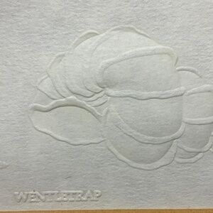 The artist used embossed printing technique to create raised, three-dimensional forms of seashells on paper, making the intricate forms and whiteness of the seashells to stand out for a luxurious, tactile effect.