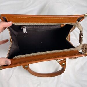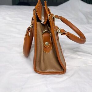 Authentic Dooney & Bourke vintage leather satchel in a rich tan and brown two-tone colorway.