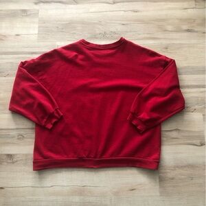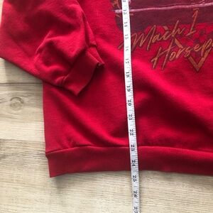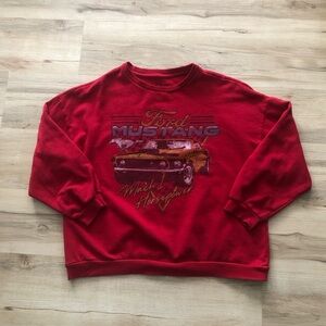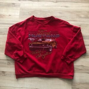 Bold red sweatshirt with Ford Mustang Mach 1 graphic. Perfect for car enthusiasts.