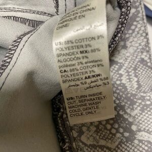 This White House Black Market women's motorcycle jacket in size 14 features a striking python printed design, adding a touch of animal print flair to any outfit. Made from a cotton blend outer shell and lined with polyester, this short length jacket is perfect for travel, casual, or business occasions. The jacket includes a zip closure, lightweight design, and convenient pockets, making it a versatile and stylish addition to your wardrobe.